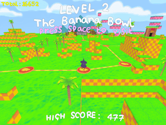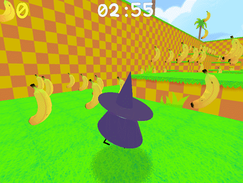 Witch’s Bananas (2023), a retro score-attack platformer, with programming by Kate Barrett, music by Ellen Davis, and art by Me.